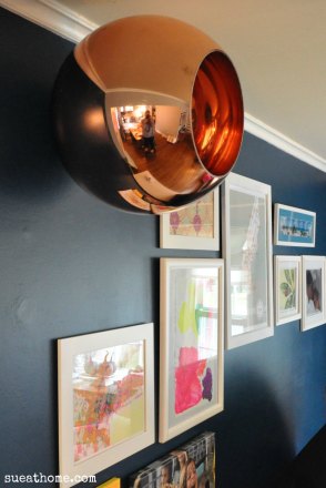 In our house, his “cave” is actually a light filled den with a fireplace…and wood paneling. His one request: The wood paneling stays. So, my plan is to go for a swanky mid-century feel like the picture above. I love how the surveillance mirrors are used as decoration. I figured the balls could sort of do the same thing. But the problem: our rooms are small. And my balls are large. (Go ahead. Let the pre-teen in you have a giggle.) You see, having a 16 inch diameter pair of balls sticking out of the wall looks like Angie from Survivor’s boobs. I stuck one on a nail from a picture of my gallery wall just so you can see what they look like hung – even though I wouldn’t put them in this space. See what I mean?