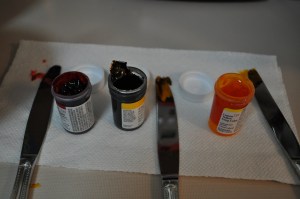 I used some blood — just kidding! — but seriously, doesn’t it look like blood? It’s actually red gel food coloring. I put a little on a plate and used a foam brush to just dab a little color onto his cheeks. Just be sure to blot it A LOT on the paper plate before putting it on the emoji. I think it worked out pretty well for those little shy guys!