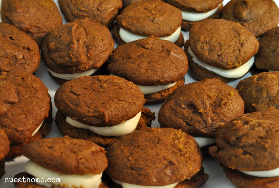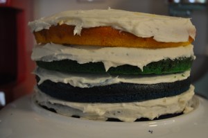 All you have to do after you cut them is pipe on the frosting. I know this may sound daunting but if you’ve ever piped “Happy Birthday Whoever” onto a cake, you can do this. It’s just a series of little half circles and lines, plus some hearts, tongues and teardrops. (I kept this image from Mister Krisp up on my laptop as I worked.) I don’t have any shots of me actually piping it because my assistants were totally over me at this point but here’s my advise: keep the piping tip close to the Rice Krispies treats, move slowly, and squeeze hard. As long as you stay close and go slow, you can’t screw it up. If I ever make this again, I’ll invest some more tips because the biggest annoyance was taking the tip off and washing it before starting the next color. Here’s a process shot with just black and white icing.