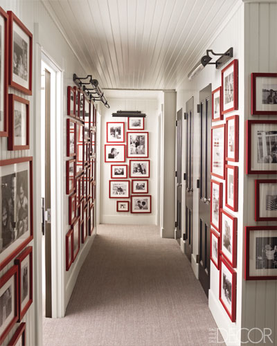 And of course, there’s always the gallery wall option. I particularly like this idea of black and white pics in all red frames. Those little gallery lights make it perfect. Via ELLE Decor.