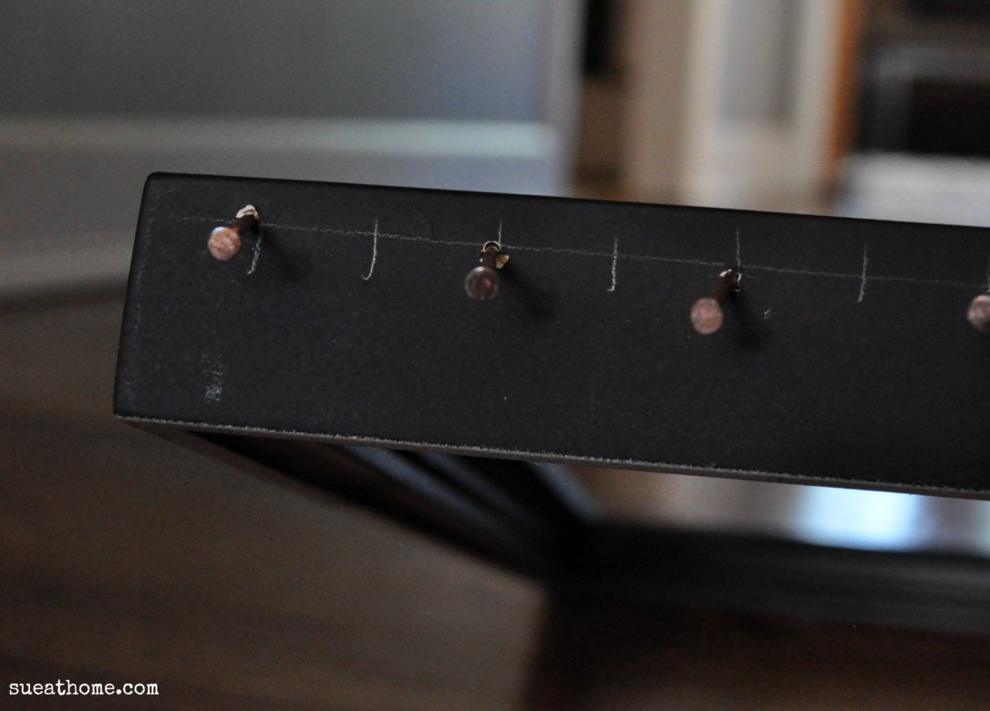 I removed everything from the frame (I would not recommend trying this with the glass still in there!) and drew a straight-ish line across the top in pencil. Then I measured 1 inch spaces across the top so the nails would be somewhat uniform. As I nailed, I decided to put some a little off the line because I figured I might split the wood if I stayed on the same line. Did it come out pretty and perfect? Nope! But as you’ll see below, you can’t tell that the nails are a little lot crooked when it’s all put together.) I was very careful to make sure they were nailed in far enough to hold a necklace but shallow enough so they weren’t coming through the other side.