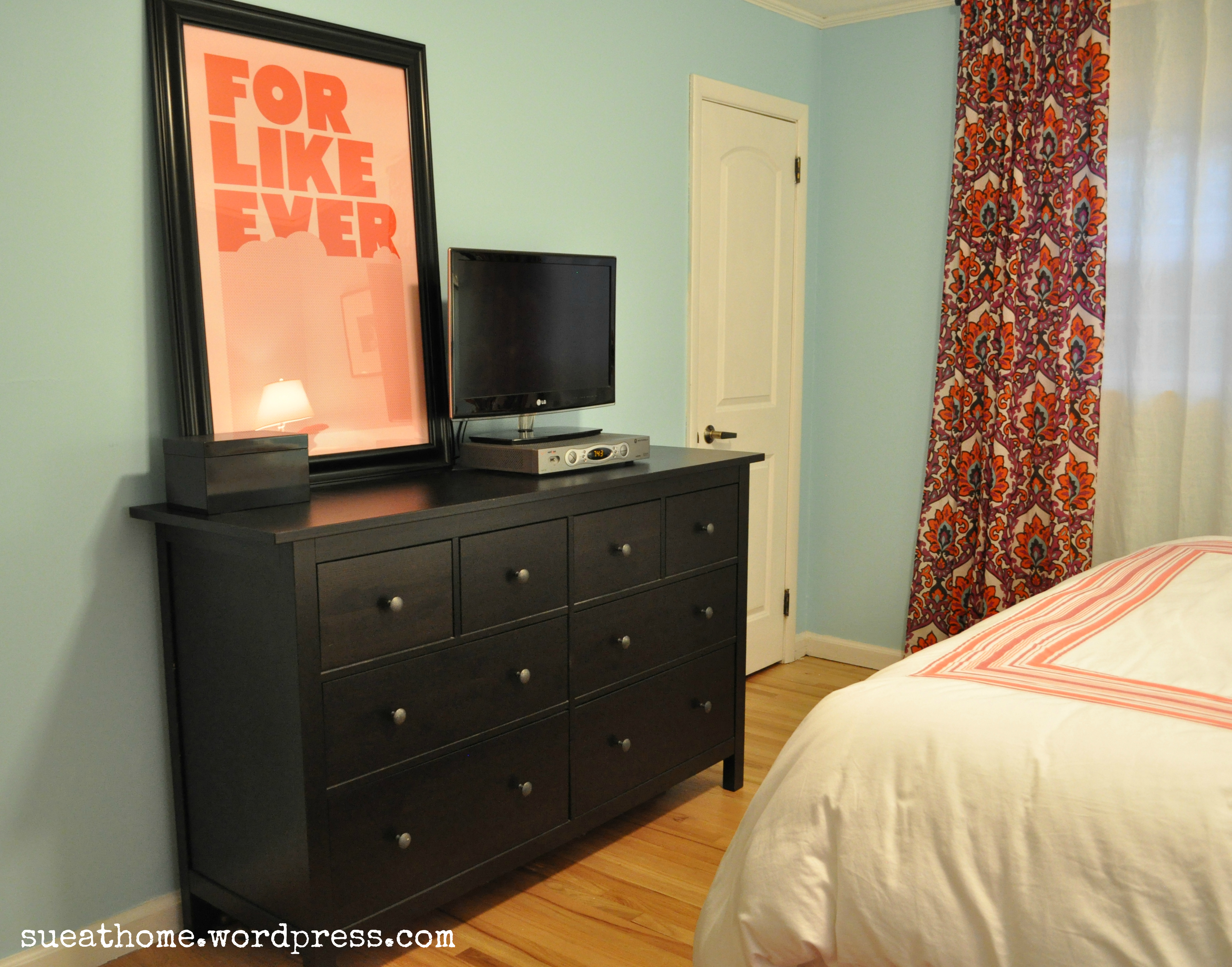 Not quite the beautiful accompaniment I always believed it would be surrounded by but it’s a work in progress. (Which is just how I like my home. I mean, what will I do when the renovations and decorating are done?) Some might think a master bedroom should be serene and romantic. But what’s more romantic than the sentiment that I will love Pablo “for like ever”?